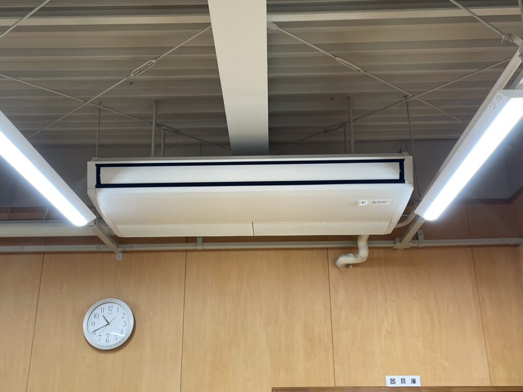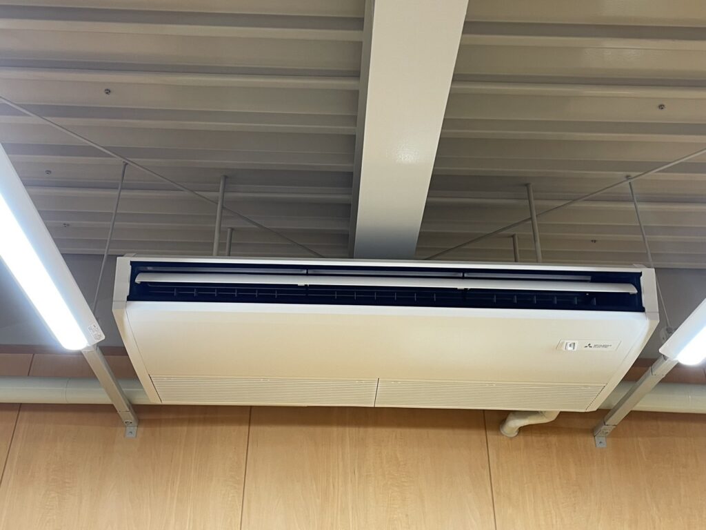 今回の施工では、施設の広さと利用目的を考慮し、最適な能力を持つ8台の天吊り型業務用エアコンを選定しました。